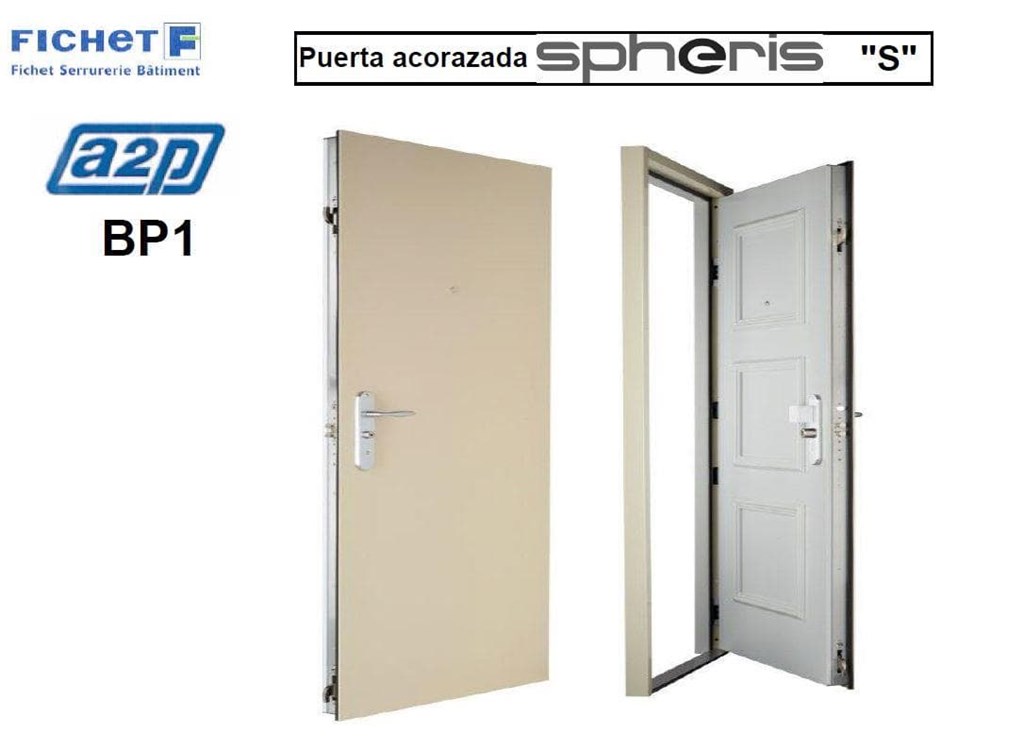 La puerta acorazada para piso Fichet Spheris S esta certificada A2P BP1 (norma francesa) y CR3 EN 1627 (norma europea), asi mismo esta equipada de una cerradura de 3 puntos certificada A2P* y sus bisagras son ocultas.